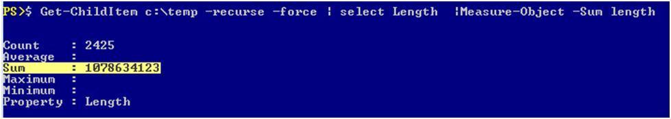 Unlike VBScript, Powershell doesn’t have a direct method for getting a folder size, but there is a work around. You can use the “Measure-Object –Sum” cmdlette and properties to calculate the data.